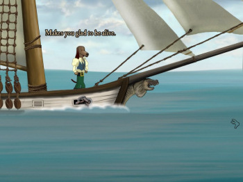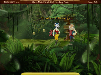 ![]() Hoewel het een cartoon is en alle karakters in het spel honden zijn, is het geen specifiek spel voor kinderen geworden. Dit komt omdat spelontwerper Goulder de honden op een menselijk volwassen, ironische manier laat reageren. Niet alleen in het taalgebruik, dat volwassen humoristisch is, maar ook door een uitstekend gebruik te maken van de specifieke kenmerken van hondenrassen. Zo is de piratenkapitein een bulldog en ondanks zijn vervaarlijke uiterlijk een barse goedmoedige hond en Sara is als cocker spaniel precies het schatje dat je verwacht. Het verhaal is op een leuke manier opgebouwd en zit vol humor, die echter wat betreft de typische taalgrappen niet altijd even duidelijk is voor niet-Engelstaligen.