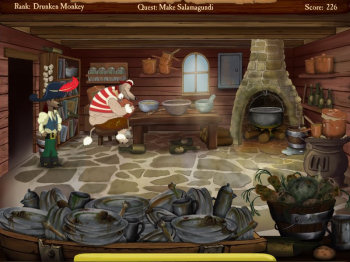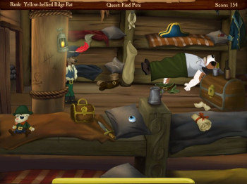 ![]() Puzzels in een humoristisch spel zijn uiteraard heel anders dan de puzzels in een horror- of detectivespel. De puzzels in Jolly Rover zijn daar geen uitzondering op. Hoewel je de meeste voorwerpen niet op de 'normale' manier gebruikt, zijn de oplossingen voor de problemen best goed te doen als je net zo leert denken als James Rover: naïef en vindingrijk. En waarom makkelijk doen als het ook moeilijk kan? Als iemand slaapt met een fles rum in zijn armen, die je graag wilt hebben, dan trek je niet eenvoudig de fles weg. Nee hoor, in dat geval ga je een moeilijke constructie bedenken met vissen en peperkorrels. Het resultaat is hetzelfde, alleen veel grappiger. Voor de ervaren speler zijn dit soort puzzels erg leuk om te doen. Voor de beginnende speler is het een prima mogelijkheid om kennis te maken met 'vreemde' problemen, waarin je in 'kronkels' moet denken om ze op te lossen.