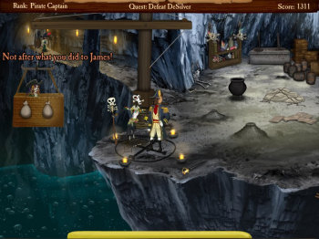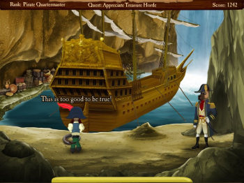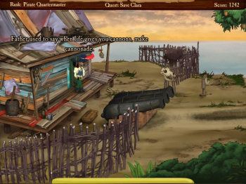 ![]() De achtergrondmuziek is precies wat je verwacht bij een cartoon piratenspel en wat spelers van de Monkey Island serie ook verwachten te horen; een typisch, vrolijk, Caribisch aandoend deuntje, dat lekker in het gehoor ligt. Het stemacteren is gedaan door professionele acteurs en dat is te horen. Van het beschaafde stemmetje van de naïeve James Rover, tot de rauwe piratentaal die van bulldog-kapitein Howell komt, het is allemaal even passend en overtuigend. Je kunt horen dat de acteurs zelf genieten van de uitstekende en grappige dialogen. Ze leven zich echt in hun rol in en klinken nergens geforceerd. Het is jammer dat het gebruikte piratentaaltje voor niet-Engelsen soms moeilijk te begrijpen is, zelfs met ondertiteling.