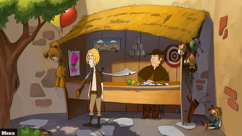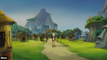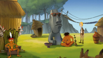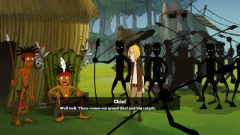 ![]() Hoewel de vlot getekende plaatjes in comicstijl zijn, zul je geen vreemde wezens zien met wonderlijke eigenschappen of lichaamsbouw. De figuren en achtergronden worden op een realistische manier in comicstijl weergegeven. De figuurtjes zijn levendig en lopen en bewegen op een natuurlijke manier. Ze bewegen hun mondjes als ze praten en ook is er andere mimiek te zien, zoals bij de pijp rokende kapitein. Humor is echter niet vergeten in dit spel. Geen absurde, komische scènes of hilarische opmerkingen, maar wel wat grappige accenten. Joyfess wil aan iedereen een flauw grapje vertellen, de indianen aanbidden in feite een recept in plaats van een door de goden gezonden boodschap en ze geven Joyfess een echt houten, gouden beeldje.