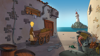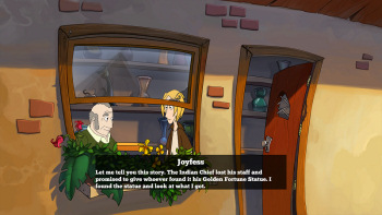 ![]() De tekeningen in Joyfess zijn mooi om te zien. Heldere kleuren en goed gedetailleerde persoontjes, voorwerpen en landschappen. Mooi zijn de indianen in de regen als ze Joyfess' diefstal hebben ontdekt. Zwarte schaduwen van indianen die levensechte en beweeglijke poses aannemen in hun boosheid. Nergens is het spel te donker om voorwerpen te vinden of te bekijken. De steeds maar het zelfde glaasje afwassende William en het invallend licht door de ramen van de bibliotheek zijn mooi om te zien. Achtergrondanimaties zijn er wel, maar niet overdadig. Je ziet weinig beweging. Er zijn meeuwen te zien in de lucht, je ziet een vis in een kom zwemmen, een klaterende fontein op een plein, maar geen rollende golven bijvoorbeeld in de branding die je hoort en ook geen in de wind wiegende bomen. En er lopen geen mensen en dieren op straat. Het is logisch dat er niet veel te beleven valt in dit leeggelopen stadje na het vertrek van de kok. Toch is het jammer. Er staan nog twee gebouwen, een stadhuis en een winkeltje, in het stadje. Die staan er doelloos, maar mooi alleen maar te staan. Ook de fruitkraam staat er doelloos te wezen. Een puzzel bij die plekken en gesprekjes op straat met figuranten, zouden het spel interessanter kunnen maken.