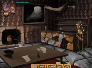 ![]() Denk na over wat Keith wil en klik vervolgens alle voorwerpen aan die je denkt nodig te hebben om aan zijn wens te voldoen. Klik dan op de magie-, wetenschap-, bouwen- of gebruikenknop en de taak wordt uitgevoerd. Onderaan in beeld zie je hoeveel voorwerpen je nodig hebt en na een poosje verschijnt ook de hintfunctie waarin duidelijker wordt omschreven wat je nodig hebt. Het is allemaal prima in orde en zelfs voor een beginnende speler goed te doen. In het tweede level krijg je de indruk dat het spel langzaamaan moeilijker gaat worden, want Keiths omschrijvingen zijn cryptischer. Jammer genoeg is dat niet het geval. Als je eenmaal het kerkhof verlaten hebt, zijn de rest van de puzzels erg makkelijk en voor de hand liggend. Bovendien zijn sommige levels heel erg kort, zodat je met tien leveltjes wel erg snel aan het einde van het spel bent. Er zijn geen gesproken stemmen in het spel. Wel achtergrondmuziek, maar die kun je beter uitzetten. Het korte riedeltje gaat behoorlijk irriteren als je langer dan 3 minuten in een level blijft.