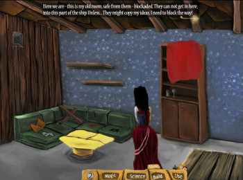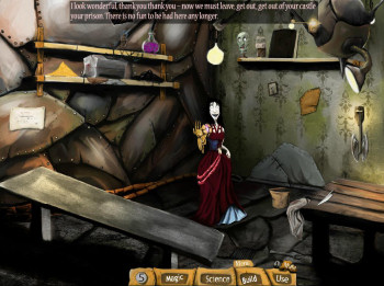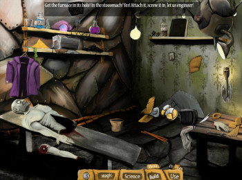 ![]() Grafisch ziet Keith the Magnificent er goed uit. De achtergronden zijn gedetailleerd en de voorwerpen die je nodig hebt zijn passend geïntegreerd. Selecteer je een voorwerp, dan wordt het actief met lichte bolletjes en lees je op het bijpassende label wat het is en wat Keith ervan vindt. Dit geeft je al een zekere hint. Via tekst aan de bovenkant van je scherm vertelt Keith wat hij wil gaan doen, zoals bijvoorbeeld een drankje maken, een graafmachine knutselen of een zombie in elkaar zetten. Keith heeft een kinderachtig en egoïstisch karakter en dat weerspiegelt zich prima in zijn cynische teksten. Het wordt consequent volgehouden tot het oubollige einde van het verhaal.