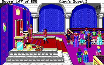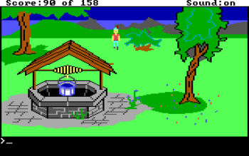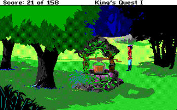![]() 1990 SCI remake versie: King's Quest I: Quest for the Crown werd in 1990 opnieuw geprogrammeerd, ditmaal met de door Sierra ontwikkelde SCI tool. Hoewel de heruitgave nog steeds slechts 16 kleuren had, werd de resolutie van de tekeningen verdubbeld en werd ondersteuning toegevoegd voor geluidskaarten zoals AdLib en Sound Blaster. Het spelverloop is geen exacte kopie van het originele spel. Het verhaal werd sterk uitgebreid, personages kregen een grotere rol en meer tekst en er zijn nieuwe personages in deze versie. Ook werden er locaties waar Graham iets kan vinden, aangepast, kan hij op meer plekken dood gaan en zijn tussenscènes toegevoegd.