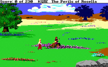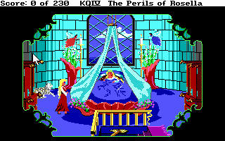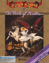 KING'S QUEST 4: The Perils of Rosella![]() Uitgever: Sierra On-Line / 1988 Ontwerper: Roberta Williams, Sierra On-Line Platform: PC. Systeemeisen: --- MS-DOS 3.1 en hoger - Processor: Intel 8088/8086 - 512 KB RAM - EGA, MCGA, VGA videokaart met 16 kleuren - Adlib, PC Speaker geluidskaart - 3.5" of 5.25" floppy disk drive. Categorie: Sprookjesachtige fantasie, zoektocht, getekende 2D en 2.5D beelden, 3de persoon, tekstinvoer, toetsenbordbediening. Extra info: In 2021 verscheen een fanmade versie van het spel, waarin een klassiek point & click bediening gebruikt wordt. Tekst invoeren is niet meer nodig, links en rechts met de muis klikken en gebruik van een inventaris met iconen volstaat. Deze "retold" versie is gratis verkrijgbaar op Adventure Game Studio Walkthrough: klik hier voor Marjo's Nederlandstalige walkthrough met tekstinvoer. Beschrijving: Koning Graham en koningin Valanice waren blij dat hun kinderen terug waren. Graham denkt dat nu de tijd rijp is om zijn oude avonturiershoed aan hen door te geven. Als hij de hoed door de kamer gooit, krijgt hij een hartaanval en zakt op de grond in elkaar. Hij wordt naar zijn bed gedragen. De enige manier waarop Grahams gezondheid kan worden hersteld, is door een magische vrucht te halen in het verre land Tamir. Een mooie fee genaamd Genesta biedt Grahams dochter Rosella de kans om naar dat land te worden getransporteerd om het fruit te vinden. Maar als Rosella eenmaal is gearriveerd, weigert de fee haar terug naar huis te laten gaan. Ze zal eerst de fee moeten helpen haar talisman terug te krijgen die is gestolen door de kwaadaardige heks, Lolotte.