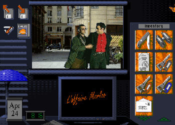 L'AFFAIRE MORLOV![]() Uitgever: Titus France / 1996 Ontwerper: CPIO Multimédia Platform: PC, Mac, CD-i. Systeemeisen: --- DOS 4.0 tot 6.22 - Processor: Intel i386 DX - 4MB RAM - SVGA videokaart - Soundblaster geluidskaart - 2x CD-ROM drive. --- MAC System 7.1 - Processor: Motorola 68030 - 6MB RAM - Sound Manager geluidskaart - 2x CD-ROM drive. --- Windows 3.1 - Processor: Intel i386 DX - 4MB RAM - SVGA videokaart met 256 kleuren en 640x480 resolutie - Soundblaster compatible geluidskaart - 2x CD-ROM drive. Categorie: Detective, mysterie, ontvoering, Parijs, full motion videobeeld, 1ste en 3de persoon, point & click. Beschrijving: Het leven van Paul Keirn, journalist in Parijs, wordt totaal op zijn kop gezet als zijn vriendin wordt gekidnapped, een vreemdeling bruut wordt vermoord en de politie hem aanwijst als hoofdverdachte. Paul heeft 48 uur om zijn naam te zuiveren, de moordenaar te vinden en natuurlijk zijn vriendin te redden. En alle actie vindt plaats in real-time! Je voornaamste taak is praten met de juiste mensen, elke locatie zorgvuldig onderzoeken op aanwijzingen en fotografisch bewijs te bestuderen. Alles met behulp van de voorwerpen in je inventaris.