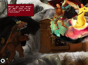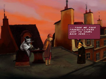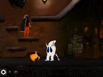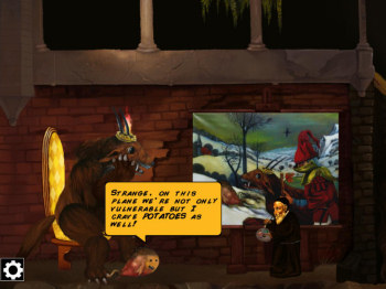![]() Grafisch ziet het spel er aantrekkelijk surrealistisch uit. Het is net een bewegende collage, zoals we die kennen uit bijvoorbeeld de Monthy Python filmpjes. Humor wordt dan ook in de beelden van dit spel niet geschuwd. Achtergrondfiguren die eruit zien alsof ze uit een schilderij van de Vlaamse Pieter Brueghel zijn geknipt, lopen en bewegen zeer soepel in kerkers met hier en daar passende animaties, zoals knipperende ogen of stromend 'water'. Je acties hebben heel vaak een onverwacht resultaat in de vorm van een filmpje. Voer bijvoorbeeld een maiskolf aan een zielenverslinder die het goed zou doen in Dantes Inferno en het resultaat is te zien in een filmpje dat op de lachspieren werkt. Ook de tussenfilmpjes die elk level afronden, sluiten naadloos aan bij de voortgang en laten je bovendien steeds achter met de vraag wat er toch aan de hand is.