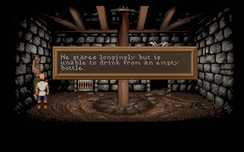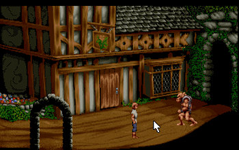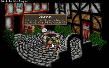![]() De besturing van het spel is eenvoudig. Klik ergens op met de muis en Diermot wandelt er naar toe. Met de enter en de spatietoets geef je opdrachten zoals "pak"en "praat met". Er zitten originele puzzels in dit spel, zoals het luisteren aan ramen om informatie te verkrijgen. Verder zijn de meeste puzzels gebaseerd op je inventaris en niet al te moeilijk. Bedenk wel dat het van belang is om de voorwerpen eerst te bekijken, voordat je ze kunt krijgen of gebruiken. De beelden zijn, zeker voor de tijd waarin het spel stamt, zeer goed. Maar vanwege de lage resolutie van 300x200, waarin het spel gemaakt is, lijkt het heel erg blokkerig op een modern 17 inch scherm. De muziek is eenvoudige midi uit de 90-tiger jaren en wordt na een poosje nogal irritant. Gelukkig kun je hem altijd uitzetten.