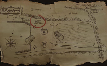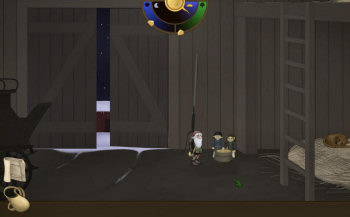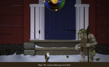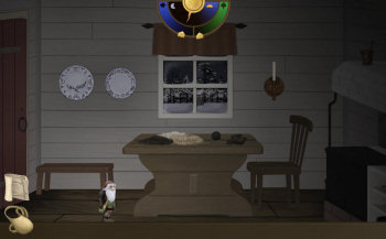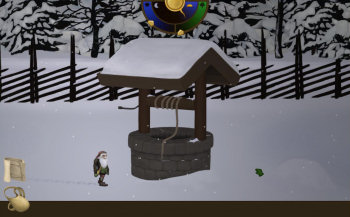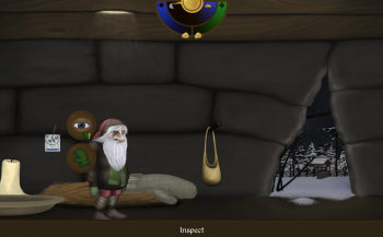 ![]() Je kunt voorwerpen oprapen, die dan naar Nisses draagtas onder in je scherm gaan. Klik op zo'n voorwerp dan wordt het automatisch en niet zichtbaar gebruikt als je op de juiste plek in beeld klikt. Doordat het hele spel verloopt via klikken, voelt het aan alsof je een interactief sprookjesboek doorbladert. Ook omdat er heel veel aanklikbaar is en Nisse overal nuttig commentaar op geeft, al dan niet voorzien van een raadsel of een hint voor de volgende actie. De achtergrondbeelden waarin dit alles gebeurt zijn in grijze en bruine winterbeelden gehouden. Alles is winters verstild. Soms zie je een sneeuwvlok vallen of ogen bewegen, maar verder zijn er geen achtergrond animaties. Nisse ademt en beweegt langzaam en dat past precies bij de koude omgeving. Je kunt overigens wel via een duidelijke, aanklikbare plattegrond wat sneller naar de andere kant van het veld gaan. Nisse en de andere wezens die hij spreekt lijken te zijn geknipt uit sprookjesboeken uit de vorige eeuw. Geplakt op de eenvoudige stylistische achtergronden draagt het bij aan de mythische sfeer van kabouters en elfen. Het ziet er overtuigend uit.