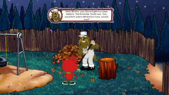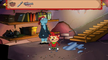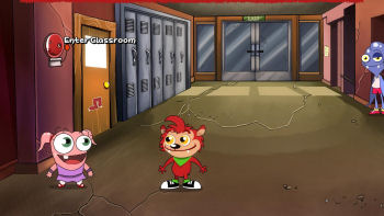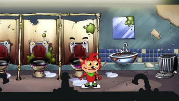 ![]() Het verhaal wordt op een leuke en begrijpelijke manier vertelt, mits je je de moeite neemt om met iedereen te praten. Soms moet dat ook, want de puzzels zijn perfect in het verhaal ingepast en de juiste vraag stellen helpt een hoop. Ook goed om je heen kijken en overal op klikken met de kijkcursor is van belang om informatie te krijgen. Klik op Blythes toilet (dat overigens beweegt en Edgar heet) en Blythe zegt dat zijn toilet honger heeft, dus weet je dat je op zoek moet gaan naar passend voedsel. Als er op het bureau van de directeur iets ligt dat je wilt hebben, is het ook logisch dat je het niet kunt pakken terwijl hij je op de vingers kijkt. Iets oprapen is trouwens net zo makkelijk als iets bekijken. Je cursor geeft precies aan wat je mogelijkheden zijn, als je ergens op klikt. En dingen die je opraapt, gaan naar een uitklapbare inventaris boven in je scherm.