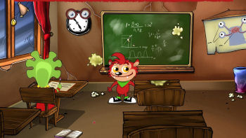![]() Grafisch ziet het spel er precies uit zoals je verwacht van een cartoon. Vrolijke kleuren en vrolijke, handgetekende karakters in een overzichtelijke, voldoende gedetailleerde achtergrond. Waar nodig, zijn er overzichtelijke close-ups. Het geheel is een plezier voor je oog. Voor je het weet voelen al die vreemde monsters, elk met hun eigen herkenbare uiterlijk, als heel gewoon. Ook de animaties zijn uitstekend gedaan. Kleine animaties die de achtergrond verlevendigen en karakters die daarin heel soepel en "monsterlijk natuurlijk" bewegen. Tussenscènes zijn naadloos geïntegreerd. De overgangen van de ene ruimte in de andere kan even duren. Je went eraan. Het geheel oogt in ieder geval professioneel goed.