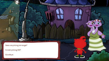 ![]() Het spel is volledig ingesproken. Elk monster heeft zijn eigen herkenbaar stemgeluid, dat goed bij het karakter past. De stemmetjes zijn uiteraard passend bij een cartoonfiguurtje en daar moet je wel van houden. Gelukkig klinken ze niet al te kinderachtig. De dialogen en gespreksopties verschijnen ook duidelijk leesbaar in een tekstballon bij degene die spreekt. En ook voorwerpen hebben een eigen naambordje. De achtergrondmuziek klinkt niet slecht. Aanstekelijk vrolijk en soms wat repetatief, maar nergens storend.