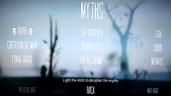 ![]() Dit verhaal ontdek je beetje bij beetje in rijmen en liederen. De verteller spreekt Russisch en de ondertiteling is in het Engels. Jammer is dan ook dat bij de tussenscenes de ondertiteling is verdwenen en de stem in een oude lokale taal klinkt. Maar gelukkig kun je wel het verhaal compleet in het Engels krijgen door de stukjes Mythe die je bij de totempalen vindt, te openen met een druk op de knop in het menu. De muziek is niet onaardig en past zeker wel bij de sfeer, maar is ook repetatief, net als de geluiden van geesten en wolven.