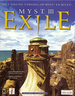 MYST III: Exile![]() Uitgever: Ubisoft / 2001 Ontwerper: Presto Studios Platform: PC, Mac, Playstation 2, Xbox. Systeemeisen: --- Windows 95 - Processor: Pentium 2 233MHz - 64Mb RAM - DirectX 7 - Videokaart 640x480 resolutie met 8 MB geheugen - 4x CD/DVD-rom - 200 MB vrije opslagruimte. Categorie: Science fiction, drama, vreemde werelden, geïllustreerd realisme, panoramische slideshow, 1ste persoon, point & click, NL gesproken/ondertiteld. Walkthrough: klik hier voor Marjo's Nederlandstalige walkthrough. Beschrijving en review: Exile speelt zich tien jaar later af na de gebeurtenissen in Riven. Het spel begint met een bezoekje aan Atrus en Catherine, die vreedzaam met hun nieuw geboren kind in Tamahna wonen. Atrus kan naar andere werelden linken via zijn zelfgeschreven boeken. Wanneer Atrus zich gereedmaakt om te vertrekken naar Releeshahn wordt plots zijn boek gestolen. Je volgt de dief, genaamd Saavedro naar J'nanin. Atrus' zonen Sirrus en Achenar zouden Saavedro's wereld Narayan hebben vernield en hem hebben opgesloten in J'nanin. Saavedro heeft zich weten te bevrijden en zweert nu wraak op Atrus. Terwijl je overal pagina's van een dagboek en video-opnames verzamelt, bezoek je nog 3 Ages.