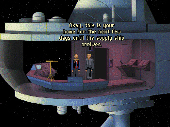 THE ORION CONSPIRACY![]() Uitgever: Domark Software / 1995 Ontwerper: Divide By Zero Platform: PC. Systeemeisen: --- MS-DOS 4.0 tot 6.22 - Peocessor: Intel i486 - 4 MB RAM - 4x CD-ROM drive - SVGA videokaart - Soundblaster compatible geluidskaart. Categorie: Science fiction, futuristisch, ruimtestation, moordmysterie, 2D en 2.5D geïllustreerd realisme, 3de persoon, point & click. Beschrijving: Het jaar is 2160 en ruimtereizen zijn heel gewoon. Je speelt de rol van de Ier Devlin McCormack als hij aankomt bij het ruimtestation Cerberus na de dood van zijn zoon Danny. Aanvankelijk is hij slechts van plan om voor een korte tijd te blijven, net zolang als de herdenkingsdienst duurt. Maar wanneer iemadeen briefje onder zijn duer schuift, waarop staat dat Danny wellicht is vermoord, besluit hij te blijven en de omstandigheden van zijn dood te onderzoeken. Danny McCormack was rustig aan het werk op een wetenschappelijk station op een asteroïde waar onderzoek wordt gedaan naar de emissie van zwarte gaten, toen een explosie door het station scheurde en zijn hoofd - zonder lichaam - de diepe ruimte in tuimelde. Blijkbaar ging Danny op expeditie naar het nabijgelegen Zwarte Gat, om vervolgens nooit meer gezien te worden. Ongelukkenzoals deze, worden vaker niet dan wel nader onderzocht, omdat individuen bang zijn een beroep te doen op een corrupte overheid. In deze benauwende omgeving heeft één enkele burger weinig kans om de loop van de gebeurtenissen te veranderen. Danny's vader staat op het punt erachter te komen wat er gebeurt als je het probeert.