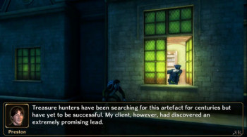 ![]() Na de verklarende intro van het spel, mag je meteen in de 3de persoon in actie komen. Preston mag proberen ongezien voorbij een open raam te sluipen. Daarbij klik en sleep je Preston op een aangegeven punt, wat voor een PC spel nogal ongewoon is. Maar het went snel en is eigenlijk wel handig. Een eind verderop in het spel mag je Preston sturen als hij weg rent en obstakels probeert te vermijden en weer verder is er een zwaardgevecht. Leuke actiepuzzels waarbij Preston wel loopt naar waar je klikt. Eenmaal in het gebouw en later ook op andere locaties, gaat het spel over in de 1ste persoon. Dan kun je op voorwerpen klikken om te op te rapen of te bekijken. De inventarispuzzels zijn niet al te moeilijk en je krijgt min of meer subtiele hints om ze op te lossen. Preston heeft ook een soort aantekenboekje dat je altijd kunt raadplegen als je het even niet meer weet. Verder zijn er de casual (schuif)puzzels, waarbij je geheime deuren en kisten en dergelijke opent. Ze zijn leuk en goed te doen.