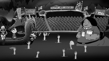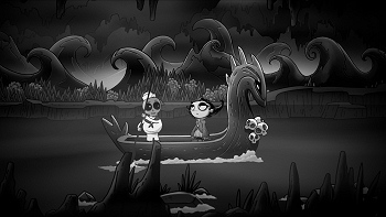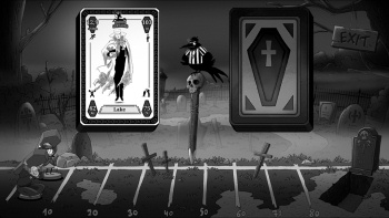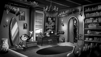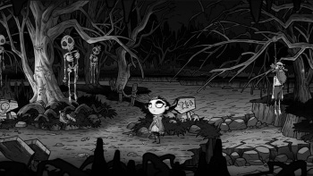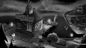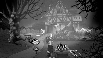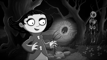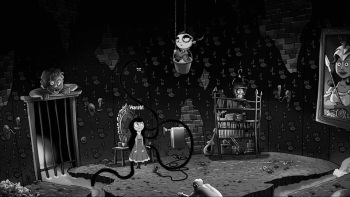 ![]() Het spel is mooi vormgegeven. Alle plaatjes zijn gedetailleerd in zwart, wit en grijzen getekend. Er komt geen kleur aan te pas. De achtergrond is goed gevuld zonder te druk te zijn of te donker. Prim beweegt soepel en natuurlijk met haar kromme beentjes en de voorwerpen zijn goed te herkennen in de inventaris. Behoorlijk wat andere figuurtjes komen schijnbaar statisch over. De meeste figuurtjes lopen niet rond, maar zitten op hun vaste plek. Persephone wiebelt echter met haar been, Echo speelt op zijn luit en de lotsgodinnen liggen met hun hoofd op de tafel, waarna ze in een flits weer opkomen en veranderd zijn in een van de andere zussen. Er is dus voldoende beweging en leven in de figuurtjes, zeker in het 'oogje' en Hank, die aan zijn boom heen en weer zwaait. Er is veel te ontdekken op de verschillende plaatsen en op de achtergrond is de animatie óók prima. Als klein plekje in een camera zie je dat een batterij werkt, je ziet rookpluimen uit de schoonsteen, regen, bliksem en donder, een vuurtje en veel meer voorwerpen die het spel verlevendigen. Het flitslicht van een camera is sterk, waardoor andere voorwerpen zichtbaar worden. Zachte melodieuze muziek, zich niet herhalende, kleine muziekstukken geven een prettige omlijsting aan het verhaal. De muziek overheerst niet. Dat is alleen de bedoeling als je de muziek van de Dood aanzet.