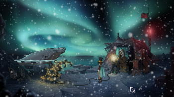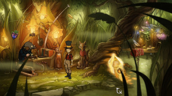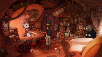 ![]() De grafische beelden zijn, zoals we langzamerhand gewend zijn van de Daedalic spellen, een lust voor het oog. Achtergronden in mooie kleurcombinaties en uitzonderlijk goed gedetailleerd. Je blijft makkelijk in elk beeld hangen om te genieten. Een stoere kabouter heeft een tatoeage van een blauwe biet op zijn arm. Jerry bloost als hij een complimentje krijgt of grijnst als hij trots is op zichzelf. Het lijken kleinigheden, maar het maakt een spel zoveel leuker om te spelen, als je ziet met hoeveel liefde de spelmakers aandacht voor details hadden. Het leuke is, dat je veel scènes bij dag en bij nacht kunt bezoeken. Zo is er 's nachts een feestje en ligt overdag de feestvierder uitgeteld over een tafeltje. Of zijn de dwergen 's nachts aan het werk en liggen ze overdag in bed. Zelfs de inventaris is bijzonder te noemen. Niet zomaar een balk met opgeraapte voorwerpen, maar ook bubbels aan een toverstokje voor de spreuken en een cadeautje-icoon voor de extraatjes. Overzichtelijk en fantasievol en te bereiken door het scrollen met je muiswiel.
