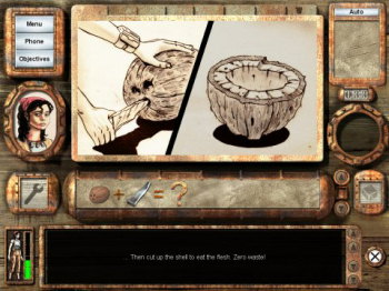 ![]() Er zitten leuke puzzels in het spel, zoals het maken van primitieve werktuigen. Veel problemen kunnen daarbij ook op diverse manieren opgelost worden. Als je bijvoorbeeld een vishengel wilt maken, hoef je niet op zoek naar die ene speciale tak die je kunt oprapen, zoals in andere adventures. Verschillende dingen uit je inventaris kunnen op verschillende manieren gebruikt worden. Wel moet je erop bedacht zijn, dat dit ook ervoor zorgt, dat de dingen die je kunt gebruiken, niet meteen zichtbaar zijn en je er makkelijk 6 keer voorbij wandelt. De grafische beelden zijn imposant en rijk gedetailleerd. Het eiland is visueel aantrekkelijk weergegeven. De muziek past goed bij het onderwerp van het spel.