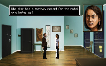 ![]() De sfeer van het verhaal wordt meteen bij aanvang duidelijk als de rabbi zegt: "De scheidslijn tussen verlossing en verdoemenis is dun. Ik weet niet meer waar ik sta en wat ik moet doen. Maar ik weet wel wie ik ben." Een rabbi die twijfelt en gedeprimeerd is. Desondanks is niet alles somber, een glimlach kan er makkelijk vanaf als de rabbi cynische opmerkingen plaatst. De Shivah is meer een interactief verhaal, dan een puzzel adventure. Er zijn vrijwel geen voorwerpen op te rapen. Wel zijn er veel dialogen, die zorgvuldig uitgekozen dienen te worden. Je kunt daarbij altijd kiezen voor een vragende, een verontschuldigende of een ietwat agressievere benadering. Het spelverloop reageert hierop, met als gevolg dat er drie eindes mogelijk zijn. Je kunt zelfs voortijdig overlijden, als je je woorden verkeerd kiest. De rabbi maakt aantekeningen en die kun je soms combineren om meer gespreksopties te krijgen. Ook heb je voor sommige puzzels een Joods woordenboek nodig, dat uiteraard in het spel in ingebouwd. Verder maak je gebruik van de PC van de rabbi om noodzakelijke adres- en andere gegevens te krijgen.