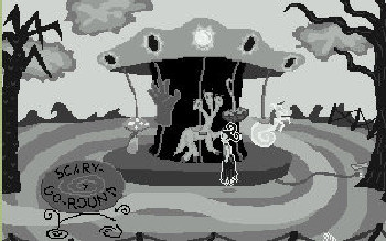 SPOOKS!![]() Uitgever: Erin "The Ivy" Robinson / 2006 Ontwerper: Erin "The Ivy" Robinson/2006 Platform: PC. Systeemeisen: --- Windows Categorie: Fantasie, spookje, zoektocht leven, 2D handgetekende beelden zwart-wit, 3de persoon, point & click. Walkthrough: klik hier voor Marjo's Nederlandstalige walkthrough. Beschrijving: Mortia, een kleine ghoul, gaat naar de kermis in het land der doden. Bij een darts-spelletje wint ze een goudvis. Die goudvis is levend en niemand hier weet wat dat is. Dus gaat Mortia op onderzoek uit, want ze wil haar vis, die ze Spooks genoemd heeft, niet verliezen. Dit eerste spel van Erin is gemaakt in AGS. De tekeningen zijn verfrissend goed en zijn, heel apart, in grijstinten gehouden, passend bij de dodenwereld. Zo zie je dus ook alleen Spooks in oranje. Pas als Mortia in de echte wereld is, verschijnt meer kleur. De geschreven dialogen zijn gevat en leuk, de muziek beslist niet storend. Een klein spel (ong. 1 uur), maar zeker de moeite waard om te spelen.