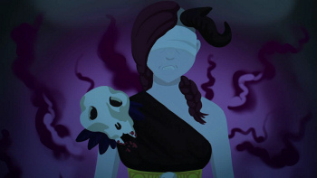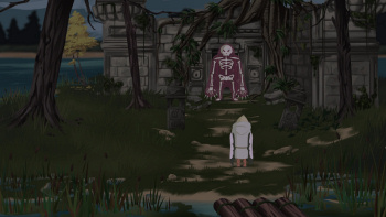![]() De puzzels zijn gevarieerd. Suli mag andere bewoners helpen met een probleem, een vlot bouwen, uit een gevangenis ontsnappen, een toverdrank maken en een walvisprins terugbrengen bij diens moeder. Zijn belangrijkste taak is, dat hij de hulp moet zien te krijgen van de verschillende goden van het eiland en de zee, om uiteindelijk de harmonie in het dorpje te herstellen. Er zijn vooral dialoog- en inventarispuzzels, maar ook moet je in een mini-game een muziekstukje nafluiten. Dat is óók te doen voor slechthorenden omdat je niet je gehoor, maar je zicht nodig hebt om de puzzel op te lossen. Verder is er een zwaardgevechtals mini-game, waarbij het niet aan komt op behendigheid of snelheid, maar op het onthouden van de plekken die je in de juiste volgorde moet raken. Een aardige inventarispuzzel is het maken van een toverdrank, waarbij je speciale, lastig te vinden bloemen voor nodig hebt. In het bos wemelt het van de bloemen, ook van bloemen die net iets afwijken maar wel de zelfde naam hebben. Hier wordt behoorlijk wat zoekwerk verwacht.