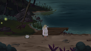 ![]() Er is veel aandacht besteed aan de achtergrondmuziek. Zachtklinkende kabbelende, soms tokkelende, samenhangende toontjes die vooral bij de scènes aan zee goed passen en een dreigender muziekstuk aan het einde. In de troonzaal bij de walvis-koningin is een muziekje dat op dansmuziek op een ouderwetse kermis lijkt, met accordeonklanken erbij. Elke plek heeft wel zijn eigen muziekje. Er zijn geen grote composities of muziek die de gebeurtenissen of emoties benadrukken, behalve aan het eind waar de muziek opzwepender is. Er zijn weinig achtergrondgeluiden te horen, maar wel voldoende aanwezig om de sfeer te voelen. Je hoort uilen en meeuwen roepen, kwakende kikkers en er is wat geritsel in een struikje. Het ruisen van de zee klinkt door in de begeleidende muziek. Er zijn geen sprekende karaktertjes in het spel. Een enkele keer hoor je alleen wat stemgeluidjes waar je, heel soms maar, taal in kunt ontdekken. Er is één Frans sprekende stemacteur, die niet vaak aan het woord is. De verteller aan het begin en het einde is te horen in het Frans, waar Engelse ondertiteling bij is. De geschreven Engelse teksten zijn overigens goed, zonder storende fouten.