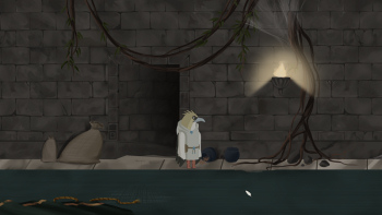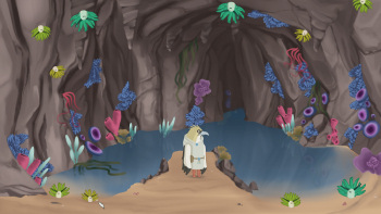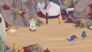 ![]() Het spel heeft een aardig onderwerp en is gesitueerd op veel plaatsen waar behoorlijk wat te zien valt. Je ziet Suli in zijn eigen huis, in het dorp, het bos, de bodem van de zee en in tempels. Dit alles is getekend in een herkenbaar eigen stijl, in heldere, zachte kleuren met veel duidelijke details. De tekeningen van de zeebodem zijn prachtig en kleurrijk met al die koralen op rotswanden en grotten en kleurige huisjes. Een muisje dat Suli helpt is ronduit vertederend en tovert een glimlach op je lippen, als je ziet hoe hij zich heeft uitgedost. Op de achtergrond zijn er niet te veel bewegingen te zien, maar wel genoeg om het spel niet statisch te laten zijn. Je ziet een wapperende vlag, dwaallichtjes en vuurvliegen en wuivende grasjes in het bos. De rondkrabbelende snelle krabbetjes zijn heel aardig en levendig om te zien. Suli beweegt niet veel, wat vooral duidelijk is als hij ongezien langs wachters moet komen. Hij sluipt of kruipt dan niet, maar looptop de gewone manier achter hen langs met bewegende vleugeltopjes. Zijn mondje beweegt bij het praten en af en toe zie je aan zijn hoofdje dat hij iets opmerkelijks ontdekt. Dan gaat er een lichtje bij hem op in de vorm van een uitroepteken.