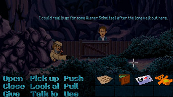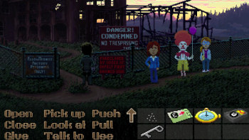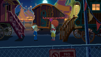 ![]() Grafisch gezien lijkt het spel eveneens uit 1990 te komen, al is het uiteraard in een moderne hoge resolutie gemaakt. 2D achtergronden in vrolijke kleuren en aan de onderkant van je scherm een grote balk met actie-opties zoals walk-look-use enzovoorts, naast een uitgebreide hokjes-inventaris waarin je de meest vreemde dingen kunt bewaren om te combineren en te gebruiken of juist niet. De achtergronden zijn daarbij heel gedetailleerd. Zo gedetailleeerd, dat je soms goed moet kijken om het voorwerp te zien dat je nodig hebt, net als in die oude spellen. Hier wordt ook wel de draak mee gestoken, door je te laten zoeken naar pixels. Letterlijk een klein vierkant puntje ergens in een scherm en er zijn er honderd, verspreid door het spel. Ook in de prima vloeiende animaties worden details niet geschuwd. Geniet van de sterren aan de hemel, die vrolijk knipperen of gruw van de vliegjes boven de snacks. Loop met de clown in zijn woonwagen eens naar links en rechts. Je zult zien dat de woonwagen licht kantelt. Merk in elk scherm wel iets op, dat geanimeerd de boel levendig maakt.
