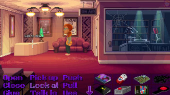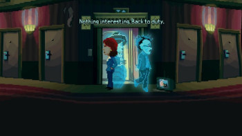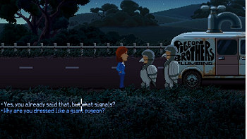 ![]() De achtergrondmuziek past uitstekend bij de sfeer van het moment. Heuse circusmuziek bij een voorstelling, rustige pianoklanken in het hotel en dergelijke. Het stemacteren is professioneel goed en de acteurs hebben duidelijk plezier in hun werk. De dialogen zijn humoristisch, soms overduidelijk, soms alleen voor insiders, zoals bij de sneer naar Lucas Arts en Siera On-Line, twee grote uitgevers van adventures in de vorge eeuw of bij een optioneel gesprek met een figurant op de krantenredactie, die je de Amerikaanse wetten tot in detail wil uitleggen. Let en klik ook zeker op posters of bezoekers van een circusvoorstelling om nostalgisch te genieten. Het is niet voor niets 1987 in Thimbleweed. Humor vind je niet alleen in de gesproken teksten, maar ook subtiel in de achtergrondbeelden, animaties, puzzels (trap in bieb!) en zelfs onverwacht in een telefoonboek. Bekijk het telefoonboek en bel eens een willekeurig persoon op. Je zult merken dat je antwoord krijgt in de taal, die bij de naam past. De namen en de ingesproken tekst zijn vermoedelijk van de Kickstarter donateurs, net als alle boeken in de bieb, die een titel, schrijver en twee pagina's tekst hebben.