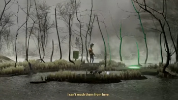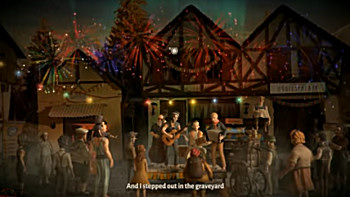 ![]() Een bijzonder aandachtspunt is de muziek. Op sommige plaatsen zijn er slechts wat bij elkaar horende klanken te beluisteren, maar er zijn ook stukjes melodieuze jazz te horen. De band, die in het dorpje optreedt, geeft een aantal nummers ten beste die aan de songs van Leonard Cohen doen denken. Melancholieke teksten op even melancholieke melodieën. Je moet het hele optreden, vier songs, van die band aanhoren. Pas daarna kun je verder met het spel. De songs zijn zó sfeervol dat je als speler de neiging krijgt ze meer dan eens te beluisteren. Ook geluiden op de achtergrond zijn aanwezig. Het gekras van kraaien die je kunt lokken, een vallend karretje in een afgrond gevuld met water, voetstappen op een keldertrap enzovoort. De stemacteurs doen hun werk goed. Beslist geen irritaties dus over onnatuurlijke, aanstellerige stemmen of óver-acteren.