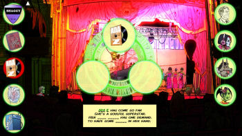 ![]() Maar uiteraard wil Finklestein zo snel mogelijk weg uit de stad. Gelukkig heeft hij een geheimzinnige celgenoot, die hem leert hoe hij moet "body hoppen"; met je geest in het lichaam van een ander wezen kruipen. Dat lukt door een liedje te zingen over iets wat je over die persoon te weten kwam, namelijk de naam, iets wat hij/zij haat en iets waar hij/zij dol op is. Het voornaamste puzzelelement in het spel bestaat dan ook uit goed om je heen kijken en heel veel met alle karakters praten. Belangrijke 'voorwerpen en personen' verschijnen in je inventaris, zodat je weet wie en wat je kunt gebruiken in je lied. Is er interactie (pakken, praten) mogelijk, dan verschijnt een icoon in beeld, mits je dichtbij genoeg staat. Nadeel is natuurlijk wel dat er naast het praten verder niet zo heel erg veel te puzzelen valt. Niet echt moeilijk in ieder geval. Finklestein begint met zijn advocaat en buiten de cel springt hij dan verder van de ene in de andere. Dat gaat niet vanzelf, want niet ieder lichaam dat hij in bezit neemt, kan zomaar het juiste voorwerp en de juiste informatie pakken om verder te kunnen zingen en hoppen. Bedenk bijvoorbeeld dat een vleermuis kan vliegen.