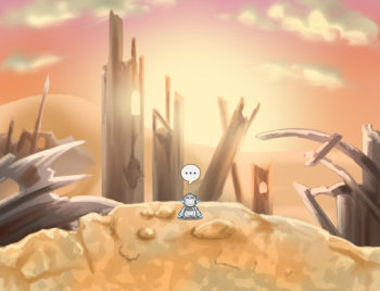 ![]() Grafisch ziet het spel er schitterend uit. De achtergronden zijn ondanks de verwoesting van de planeet prachtig vaag en in pastel tinten gehouden. Overdag een stoffig geeloranje oppervlakte, 's nachts blauwgrijs met rode planeten in de lucht, binnen een chroomkleurtje. Wat je ook bekijkt, alles ziet er eigenlijk lief en onschuldig uit. De robotjes zijn wat hoekiger omlijnd en je ziet ze in vogelperspectief, maar dat accentueert juist dat het machientjes zijn. Er zijn heel veel tussenfilmpjes, die naadloos aansluiten op de puzzelvelden en een overgang vormen van het ene naar het andere scherm. Je laat de robotjes bewegen door middel van het toetsenbord. Kunnen er andere toetsen voor een actie worden gebruikt, dan wordt het duidelijk met een popup schermpje aangegeven. De emotie- en spraakicoontjes staan in een tekstballonnetje.