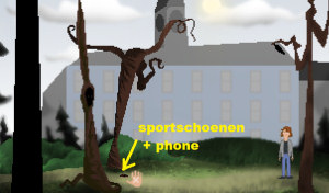 Gebruik de liftknop. Links staat het visioen van de morsige student.Kies de 2e verdieping. Ga de rechter klapdeuren door en er verschijnt een portal. Crystals visioen is te zien. Praat met haar. Ze was gevangen door een Reaper en is door de portal gekomen. Ze hoopte Steve te zien. Ze moet in de buurt van de portal blijven. Ze zegt dat ze eerst alleen bij de Reaper was, maar dat Grant er nu ook is. Voor Murray een bewijs dat Lloyd er niets mee te maken heeft. Grant was immers diens beste vriend. Over Crys zegt Crystal dat ze hem niet kent. Murray belooft dat hij Steve zal halen. Murray kan de portal niet door. Bekijk het prikbord. Bekijk het glazen kantinedak en bekijk alle lockers. Ze zijn van Crystal, Murray, Lloyd, Eve, Steve en er is er een van Elisa, die Murray nooit ontmoet heeft. Open Crystals locker. Ze had die leeggemaakt. Open Murrays locker. Hij haalt zijn locker leeg en heeft Crystals telefoon, de sportschoenen en het vergrootglas weer in zijn inventaris. De andere lockers zijn niet te openen zonder code. Ga terug de deur door. In het lokaal naast de lerarenkamer is nog steeds les, dus kan Murray er niet in. Ga met de lift naar beneden. De deur wordt nog steeds versperd door de elektricien en de receptioniste. Geef de sollicitatietips aan de receptioniste en ze vertrekt met de elektricien. Open de deur en ga rechts naar het moeras. Gebruik de sportschoenen in de modder. Murray loopt door het moeras heen naar het schoolplein. Daar vindt hij Steve en Danielle. Murray praat vanzelf met Steve. Het maakt niet uit welke gespreksoptie je gebruikt. Steve zegt dat hij later zal uitleggen wat hij met Danielle heeft en vraagt naar Eve. ![]() Kies een willekeurig antwoord. Geef ook een willekeurig antwoord op Steves vraag over Danielle. Murray vraagt zich af hoe Steve door de modder hier bij het schoolplein kon komen. De kantinedeur is immers op slot. Hij begrijpt ook niet waar Danielle heen is gegaan. Loop iets naar rechts. Er zit een scheur in de grond. Bekijk de scheur. Die is na Crystals verdwijning ontstaan. De ladder en de portal