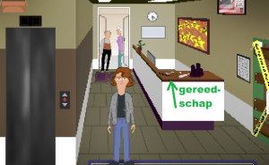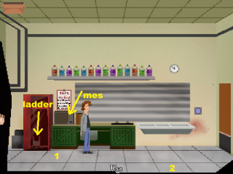 Ga eens kijken bij de elektronicawinkel. Het gesprek begint vanzelf.De man wil de elektriciteit op school wel in orde brengen, maar tegen betaling. Murray heeft dus een baan nodig. Hij gaat vanzelf naar buiten. Ga de on£ders in en praat met de jongen. Je kunt zijn bibliotheekkaart (library card)lenen. Er is geen vacature. Ga de deur uit. Ga de bibliotheek in en praat met de bibliothecaresse. Vraag naar een boek. Zeg dat je een kaart hebt en Murray hoort dat de jongen die de kaart uitleende, Crys heet. Het is de jongen die zoveel mailtjes aan Crystal stuurde. Kies het boek met sollicitatietips (101 Job Interview Tips). Ga naar buiten en praat met Crys in On£ders. Murray licht Crys in over Crystals verdwijning. Laat het boek zien en ga naar buiten. Klop op de viswinkeldeur en vraag naar de vacature. Zeg dat je de baan wilt en vraag naar het aantal sollicitanten. Na het gesprek sluit ze de deur. Bekijk, met het handje rechtsklikkend, het sollicitatieboek en onthoud wat er ongeveer staat. Let op:De tekst die je leest, kan steeds een andere zijn. Ga naar On£ders en laat de vacature aan Crys zien. Hij roept zijn baas. De baas wil nu een sollicitatiegesprek met Murray voeren. Murray oefent een sollicitatietip. Als je een keuze maakt die lijkt op de tekst uit het sollicitatieboek, wordt Murray aangenomen. Kies je de verkeerde tekst dan wordt hij afgewezen. NB: Als Murray afgewezen wordt, kan hij het opnieuw proberen. Kijk in het boek en praat met Crys. Dan kan je weer het kantoor van de baas in. Kies een antwoord dat het meest lijkt op de tip in het boek. Murray krijgt de baan en zijn salaris, maar Crys wordt ontslagen. Murray is alleen in de winkel. Ga de achterdeur door en hij vindt Crys' CV. Bekijk het. Ga de winkel uit en loop de elektriciteitswinkel in. De elektricien gaat meteen naar school om de elektriciteit in orde te maken. Ondertussen zie je Danielle die tegen Steve zegt dat hij 's middags naar school moet komen met al zijn vrienden. Daarna zie je Murray in school. De elektricien repareert de elektriciteit en de receptioniste legt alle sleutels (keys) op de balie. Murray doet ze automatisch in zijn inventaris . Lees het ontslagbriefje van de kantinejuf op de kantinedeur. Ze heeft zonder betaald te worden het hele weekend gewerkt omdat er een leerling in de kantine bleef en heeft er genoeg van. Pak de politielinten (warning tape) van de kantinedeur. ![]() De planken zijn niet van de deur te verwijderen zonder gereedschap. Pak gereedschap (tools) van de balie en haal de planken ermee weg. Gebruik de sleutels op de deur. Ga de kantine in. Er hangt een kotslucht, dus doet Murray de deur weer dicht. Open de lift met de sleutel. Je gebruikt de sleutel in de liftknop. Lloyd komt de lift uit. Hij blijft tegen Murray praten zonder dat Murray iets tegen hem kan zeggen. Open de kantinedeur. Lloyd gaat naar binnen. Doe de deur dicht en gebruik de sleutels om Lloyd op te sluiten. Dit moet je snel doen, omdat Lloyd anders weer de hal in komt. Murray doet vanzelf de politietape weer over de deur en de receptioniste en elektricien praten verder. Ze blijven in de weg staan. Lockers