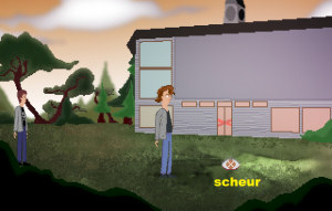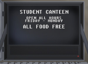 Danielle zit aan een tafeltje in de kantine waar Crystal haar tekening maakt.Ga de kantine in. Rechtsonder zie je een tekeningetje waarmee Murry kan veranderen in een Reaper. Ga via de foyer naar het moeras. Bij het modderpad merkt Murray op dat er veel lawaai komt uit de stad. Er staat een boom i.p.v. een boomstronk. Wissel van vorm en ga de modderpoel door richting schoolplein. Verwissel van vorm en ga het schoolplein op. Je kunt niet dezelfde weg terug. Ga dus via de kantine de school weer uit naar het moeras. Ga naar het winkelcentrum. De lerares heeft allerlei journalisten rond haar winkel staan. Een jongen loopt ontevreden weg. Volg hem naar school en ga de school in. De student staat bij de lift. Bekijk de student en praat met hem. Het is de morsige jongen die een maaltijd van Murray kreeg in de kantine. Omdat dat nog niet gebeurd is, kent de jongen Murray nog niet. Hij stelt zich voor als Hugh. Praat verder met hem. Vraag pas op het laatst of je langs hem de lift in kan en zeg dan: Look behind you! Murray verandert dan vanzelf in een Reaper om de lift te nemen. Hij krijgt boven zijn normale vorm. ![]() Verander boven wéér in een Reaper om de computer te bedienen. Verander de tekst in: Student canteenen Open ... to Mondayen All food free!. Ga als Reaper het raam door, links van de computer. Gebruik het handje daarvoor. Murray is in de kantine en verandert in de menselijke vorm. Ga de kantine uit en loop naar de lift. Praat met Hugh: zeg hem naar de tv te kijken. Hugh gaat meteen bestellen. Ga de kantine in. Ook Daniëlle is opgestaan om iets te bestellen. Crystals tekening
