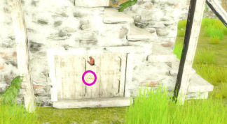 Achter de muur zie je op de grond in een hoekje, een paar dennenappels liggen. Raap een dennenappel (pine cone) op.