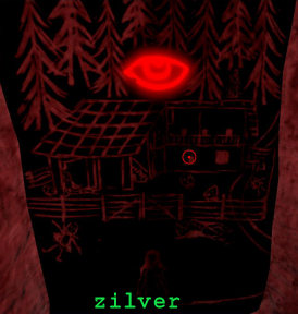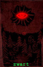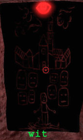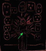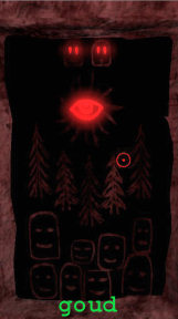 Alles is hier veranderd! De muren zijn bedekt met geschilderde ogen. Alles lijkt verwrongen en krom. In de nissen zie je nu in plaats van een tekening, een zwarte vlek die op een grote vlam lijkt, maar alleen als je het masker van de moordenaar draagt.