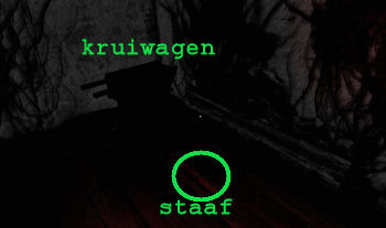 - Word je cursor een rood cirkeltje, klik dan met de linker muisknop en er opent een menuutje waar je kunt kiezen uit: 'use' (gebruiken) - 'examine' (bekijk) - 'pick up' (oprapen).