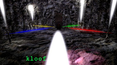 Hang dan het masker van de goden op de middelste spiegel en vvan hieruit verschijnt een brede witte lichtstraal naar de overkant van de kloof.