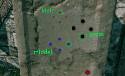 Het is inderdaad erg mistig op de rivier.Dery komt in aanvaring met een rots en stapt aan land om te wachten tot de mist is verdwenen. Hij weet niet waar hij is, de boot is kapot en hij is wat spullen uit zijn inventaris kwijt. Hij heeft alleen het testament (testament) bij zich en een mes (knife). Pak de plank (board) op die op de oever ligt. Ga het bos in. Bekijk het bosje naast de grote rots en Dery pakt er een houten schijf (small wooden disc) uit. Er is uit drie paden te kiezen. Het rechter pad brengt je bij steeds hetzelfde plekje terug en ook het pad links brengt je naar diezelfde plek. Kies dus het pad naar boven, links van de rots. Daar zie je een klein rotsblok in het midden met daar rechts naast een struikje, waar niets te vinden is. Rechts en links van het rotsblok zijn 2 paden. Ook kun je naar rechts. Dat brengt je terug naar de vorige plek. Neem het pad naar links. Je ziet een grafsteen met potjes bloemen erbij. Bekijk de grafsteen rechtsklikkend. Je krijgt een hint voor een latere puzzel: Blood flows to the north. To the east the river merges (komt samen). And to the south, what sort of dark future awaits it? Bekijk het linker potje bloemen en Dery haalt er een 2e houten schijf (medium wooden disc) onder vandaan. Je kunt hier naar boven en naar links. Ga naar links. Bekijk de kale boom en Dery pakt een 3e houten schijf (big wooden disc) weg. Bekijk de diepe put, die de weg naar links onmogelijk maakt. Leg de plank over de diepe kuil. Ga het gemaakte bruggetje over naar links. Dery komt aan bij een huis. Het huis, schijvenpuzzel ![]() Klop op de deur maar er wordt niet opengedaan. Bekijk de monoliet naast de deur. Het is een schacht en er staan knoppen op in de kleuren rood, zwart en blauw. Ook zie je een tandwiel onderaan. Het is de bedoeling van deze puzzel dat je de houten schijven op de juiste knoppen zet. Je moet niet alleen letten op de grootte van de schijven, maar je moet ook de juiste knop vinden. Gebruik voor de oplossing de hint die je kreeg bij de grafzerk. Als je het goed hebt gedaan werkt het mechanisme en wordt de deur geopend. - Zet de kleine houten schijf op de bovenste rode knop (blood-north). - Zet de grootste schijf op de onderste zwarte knop (dark future- south). - De middelgrote schijf hoort op de rechter blauwe knop (river-east). Luister naar het geluid dat je hoort, als je het tandwiel bedient. Als je één schijf op de goede plaats hebt gezet, hoor je clank. Als je twee schijven goed hebt geplaatst hoor je twee keer geluid (clank-clank). Zet de drie schijven op de juiste plaats en je hoort clank-clank-clank. Een oude man opent de deur. De oude man begrijpt niet hoe Dery aan de schijven kon komen. Hij denkt dat zijn hond de schijven naar het bos heeft gebracht. Dery vraagt hulp en vertelt dat zijn boot het begeven heeft en dat hij naar Duruk wil. De man wil hem wel een lift geven naar het dichtbij gelegen dorp Furat en zegt dat Duruk nogal ver weg ligt. Ze kunnen 's nachts in Furat zijn, maar de man moet nog wel wat werk doen in zijn tuin. Terwijl de man aan het werk is, stelt Dery vanzelf nog wat vragen. Hij wil weten van wie het graf is in de bossen. Het graf is van de vrouw van de oude man, aan wie hij nog heel veel denkt. Dery begrijpt dat omdat hij zijn overleden zoon Don mist, die pas 5 jaar was. De mannen stellen zich aan elkaar voor. De oude man heet Tobe en waarschuwt Dery voor Duruk waar de nieuwe, onsympathieke gouveneur het leven moeilijk maakt voor de inwoners. De gouveneur wil het hele koninkrijk Arval besturen en heeft zijn vader links laten liggen toen die financieel aan de grond zat. Tobe brengt Dery naar Furat en Dery opent zijn hart en vertelt dat zijn zoon Don een paar jaar geleden aan de pest is gestorven, waarna Dery in een depressie belandde en zich aan alcohol en gokken overgaf en daardoor al zijn bezittingen kwijt raakte. Tobe vertrekt nadat hij Dery een plattegrond heeft gegeven. Het dorp Furat