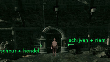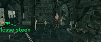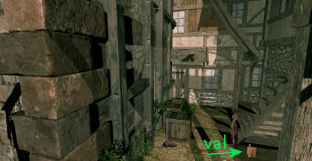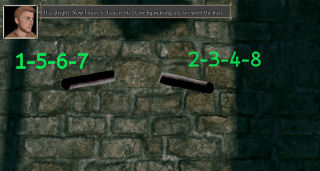GevangenisBij de stadspoort wordt Dery onmiddellijk gearresteerd. Hij hoort soldaten praten. Koning Falog zou het koninkrijk hebben verlaten en de schatten van het land hebben meegenomen. Dery wordt in de gevangenis gegooid. De soldaten hebben bijna alle inventarisspullen afgepakt. Hij heeft alleen het testament nog en zijn mes. ![]() Doorzoek het bed en Dery vindt er een ijzeren staaf (bar) die in tweeën is gebroken. Je krijgt er de deur niet mee open, maar als je de muur linksvoor bekijkt, kom je in een close-up terecht en zie je dat er een losse steen in de muur zit. Bekijk de losse steen. Dery kan zijn handen niet gebruiken om hem los te wrikken. Gebruik dus de twee ijzeren staven. ![]() ![]() Je ziet aan de linker- en de rechterkant van de steen nu twee staven staan. Wrik de steen er als volgt uit: Klik 1x op de linker staaf. Klik dan 3x op de rechter staaf, 3x op de linker staaf. Klik nogmaals op de rechter staaf en de steen is uit de muur gehaald. Dery gaat de gevangenis uit. De koning Dery leest op de deur van de notaris dat de notaris een dag afwezig is. Een soldaat wil hem weer arresteren en Dery ontloopt hem vanzelf, maar valt door een luik. Dery is in een ondergronds gebied bij een waterstroom. Bekijk de waterstroom en hij pakt er een riem (belt) uit. Pak ook de hendel (lever) die tegen een rots aan ligt. Ga rechts de grot in. ![]() ![]() Bekijk het hek dat van Dery's kant niet te openen is. Zie dat er links in het hek een scheur zit en dat er rechts twee schijven in zitten. Bekijk, rechtsklikkend, de schijven. Ze zijn onderdeel van een mechanisme. Bevestig de riem aan de schijven en doe de hendel in de scheur. De hendel past. Trek aan de hendel en de schijven draaien. De deur gaat open en Dery gaat er vanzelf door. In een kooi boven een vuurtje zit de koning van Arval gevangen. Rechts ligt een dronken soldaat op de grond te slapen. De koning vertelt dat de gouverneur hem heeft gekidnapt en het volk heeft wijsgemaakt dat de koning er met de schatten van het land vandoor is gegaan. De gouverneur kan nu over het hele land heersen. Hij zegt dat de sleutel van zijn kooi te vinden is in het paleis van de gouverneur. Even later is Dery met behulp van een ladder weer op straat beland. Hij moet een manier vinden om het paleis in te komen. Een slecht huwelijk Dery vindt dat hij zich moet vermommen om niet herkend te worden. Praat met de man bij de put. Over Feyer Golish zegt hij dat het een vreemde, zuinige man was die met weinig mensen sprak. Niemand had dus door, dat hij zo rijk was. De roddels gaan dat Feyers zoon zich van Feyer heeft afgekeerd. De put wordt de bron van de wonderen genoemd. Men gelooft dat je wens wordt vervuld als je een muntje in de put gooit. De bodem moet vol munten liggen. Bekijk de put. Dery kan geen munten pakken, het touw dat naar de bodem gaat is doorgesneden. Bekijk de houten kar. Die lijkt op de kar van Mony. Ga rechts de straat in. Bekijk de ton in het midden van het scherm. Het is een onderdeel van het gereedschap van de vrouw die er zit. Praat met de vrouw. Ze is de vrouw van de man bij de put. Het was een gearrangeerd huwelijk en beiden zijn niet gelukkig. De wet staat scheidingen echter niet toe, behalve bij overspel van de man. ![]() Rechts van het huis zie je wat kliekjes op de grond. Pak ze op. In de inventaris zie je dat het gehakt (minced meat) is. Ga rechts het plein op. Je bent terug bij de put. Praat met de man over zijn huwelijk (how are ...your wife?) Hij zegt dat hij heus niet op iemand aan het wachten is, als hij hier bij de put rondhangt. Ga naar links en pak de kroes (jug) op naast het bankje. Ga naar rechts en zeg tegen de vrouw dat je denkt dat haar man haar ontrouw is (I think ... to you). Ze zegt dat als Dery bewijzen heeft ze haar man met al zijn spullen uit huis zal gooien. Geen enkel antwoord is voldoende voor de vrouw. Je zult bewijs moeten hebben. Ga de steeg in. Daar is een kat en er ligt een bolletje wol achter hem. Er staat een voerbakje in de buurt. Pak het bolletje wol (woolen thread) en bekijk de kat. Die heeft een haarbal in zijn keel, maar Dery weet dat hij die er niet met zijn handen uitkrijgt. Ga terug en ga dan weer naar de put toe op het plein. Vraag de man of hij weet hoe je een kat kunt laten overgeven (Do you ... cat vomit?). De man zegt dat hij kruiden bij zich heeft. Die kruiden helpen niet alleen laxerend bij dieren, maar werken lustopwekkend bij mensen. Daarom wil hij er geld voor hebben. Doe de wollen draad aan de kroes en je hebt een soort put-emmertje (invention) gemaakt. Klik met het emmertje op de put maar Dery heeft pech. Het touwtje breekt en de kroes ligt op de bodem. Hij moet aan geld zien te komen. Ga naar de vrouw en vraag haar om geld (a coin of 10 dollots). Geef als antwoord waarom je het nodig hebt To throw ....., dan to find a good woman. Dat antwoord waardeert ze en je krijgt een munt (dollots) van haar. Ga terug naar de man en geef hem de munt. Je krijgt een zakje kruiden (purgative). Ga naar rechts en dan de steeg in. Doe de kruiden bij het gehakt en leg het gehakt in het voerbakje. De kat eet het gehakt en geeft een haarbal over. Pak het haar (hair) en Dery zegt dat hij er een snor van kan maken. Ga terug naar de put. Vraag deze keer aan de man waarom hij lustopwekkende kruiden nodig heeft en kies alle gesprekopties die je niet eerder kon kiezen. Blijf praten tot je alle opties hebt gehad. Uiteindelijk geeft de man toe dat hij een afspraakje heeft met een mooi meisje, dat er binnen 5 minuten zal zijn. Hij wil niet dat je stoort. Ga dus weg en praat met zijn vrouw. Zeg weer dat je vermoedt dat de man ontrouw is. Kies daarna: if you want to find out, go to the well in five minutes. Ga naar rechts, maar er is niemand meer bij de put te zien. Ga terug en zie de berg spullen op de grond liggen, die de vrouw uit het raam heeft gegooid. Bekijk de kleren en Dery pakt alles wat hij voor zijn vermomming kan gebruiken. Even later staat de vermomde Dery bij de stadspoort en ziet hij Mony terug. Mony 