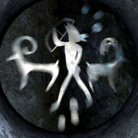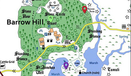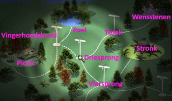 Verlaat de Quoit en sla meteen linksaf.Als je het bospad wilt nemen kun je niet verder (actiecursor). Klik op de zaklamp in je inventaris en nu kun je vrij in het bos rondlopen. Linksonder in beeld is de plattegrond te raadplegen (hij zit ook in je inventaris). Voor je uit zie je twee verkeersborden. Draai je om (tweemaal links klikken). Je ziet de gloed van de brandende drum in de verte. De telefoon gaat. Het is Emma. Zij weet nu dat jij de journalist bent die tien jaar geleden de balans heeft hersteld door offers te brengen bij de opgravingsplek. Zodoende heb je de boze oude macht weer tot rust gebracht. Jij bent de enige die, naast Emma en enkele anderen, de aard van de oeroude krachten heeft begrepen. Emma vraagt of het nu weer allemaal staat te gebeuren? Pas goed op, zeker vanavond! Draai je weer om naar de verkeersborden. Je bevindt je hier bij de viersprong (zie plattegrond). Klik op het gevarenbord met de vallende stenen en je gaat rechtdoor naar de stronk op de plattegrond. Zoom in op deze stronk (actiecursor). Je hebt iets nodig wat je nog niet bezit. ![]() ![]() Keer terug naar de viersprong en klik nu op het andere gevarenbord (wegversmalling). Je komt dan bij een driesprong met een nieuw gevarenbord, een bocht naar links. (zie plattegrond). Kies de pijl omhoog en je gaat volgens de plattegrond rechtsaf. Je komt bij een tronk waarop een rode hand is geschilderd. De boom ernaast heeft een gat. Daarin vind je een derde SIM-kaart. Zoom uit en houd daarna rechts aan en je komt uit bij de wensstenen. Wensstenen Emma belt weer en vertelt dat Mia samen met Olly Tindle en Gus Beven een bende hebben gevormd en zich ergens in het bos schuilhouden. Emma is erg bezorgd dat hen iets zal overkomen en vraagt jou om hulp. Zoom in op de linker steenhoop. Je vindt er een wensbriefje: klein volk van het bos, hoor mijn wens en maak die waar, geef Emma alsjeblieft meer luisteraars, zij is zo bedroefd sinds arme Wincey De steen beneden het briefje kun je wegschuiven. Dan verschijnt een actiecursor. Ook bovenin de steenhoop is zo'n actieplek. Er moeten dus twee dingen worden geplaatst (van Emma?) Zoom in op de middelste steenhoop. Je vindt weer een briefje: Mia Mooier dan een bloem, vogel of boom, jij bent degene, degene voor mij, de warmte van je glimlach, maakt mijn dag lichter, deze wens onthult wat ik niet kan zeggen. Dit liefdesbriefje moet van Olly afkomstig zijn die verliefd is op Mia. Deze wenssteen hoort waarschijnlijk bij Olly die het briefje achterliet. Ook hier kun je een steen verplaatsen en blijken er twee actieplekken te zijn. Zoom in op de rechter steenhoop. Je vindt er een brief van een ziekenhuis gericht aan Gus. Zijn moeder is opgenomen en wordt maar niet beter. Gus wordt uitgenodigd voor een gesprek. Deze wenssteen hoort dus bij Gus. Er moeten eveneens twee dingen van hem worden neergelegd. ![]() Zoom uit, draai je om (tweemaal links klikken), doe twee stappen naar voren zodat je het gevarenbord weer ziet, en draai je daar opnieuw om. Klik op het gevarenbord en je komt bij een plek met vingerhoedskruid. Klik rechts. Ga door het gat in het prikkeldraad en je komt volgens de plattegrond uit bij de Druïdenpoel. Druïdenpoel Verwijder het winkelwagentje. Klik rechts en je ziet een informatiebord dat door Gus is beklad. Maak het schoon met de doekjes uit de inventaris. Dan lees je: Druïdenpoel Het natuurlijke zuivere heldere water stroomt vanaf Barrow Hill en vult een door mensen gemaakt bassin waarvan wordt aangenomen dat het een offerpoel is uit de late Bronstijd. De licht weerkaatsende vijver was heilig voor de Ouden, die geloofden dat het een glimp bood van de 'andere wereld'. Kostbare voorwerpen, zoals brons, goud en juwelen werden in de diepte gegooid. Zoom uit en klik rechts. Er is een pad dat naar beneden loopt. ![]() Klik nogmaals rechts en je ziet een rotspartij die zich aan de linkerkant van de poel bevindt. Bovenop is een soort slot aangebracht bestaande uit concentrische ringen met zonnen en manen erbij (actiepunt). Aan de voorkant van de rotspartij vormt een aantal stenen een stapeling. Haal de stenen één voor één weg en je ontdekt een kristallen hanger met een brief erbij: Niet langer stroomt het zoete water uit de heuvel, het magische heldere water dat de kwaal zou kunnen genezen. Want de lentesleutel werd weggehaald van zijn rechtmatige plaats en door dieven die haast hadden op de grond gegooid. Ik beloof jou te vinden, o sleutel, kostbare sleutel, en jouw grootsheid te midden van de bomen te herstellen. Ik zal mijn hanger opladen, een kristallen gids, die beloofde jou te vinden waar jij je ook verbergt. White Wicca (witte heks) Zoom uit en merk de actiecursor op aan de voet van de rotspartij. Neem de hanger uit de inventaris en klik ermee op de actieplek. Het kristal licht op. Je kunt het heen en weer bewegen. Het kristal wordt ook actief aan het begin van de trap naar beneden en aan de voet van het informatiebord. Ga terug door het gat in het prikkeldraad (trap af en rechtsaf) en neem het pad tussen beide gevarenborden in om een volgende trap af te dalen en uit te komen bij de picknickplaats. Picknickplaats Klik op het bord met de twee wandelaars en daarna op de vuilnisbak. Je vindt een krant van 21 september 2007, dus een jaar na 'de gebeurtenis'. De kop zegt dat het benzinestation na 80 jaar sluit. Het artikel zegt dat de bevolking van Barrow Wood en Wychwood opgelucht afscheid nemen van die plek waar tieners kattenkwaad uithalen. De verdwijningen en verhalen waren de nekslag voor de activiteiten van het station. Ga naar de barbecue te midden van drie tafels. Olly's bril ligt onder het rooster! Je kunt het rooster niet wegnemen bij gebrek aan het juiste gereedschap (actiepunt). Richt je op de rechter tafel. Het mos op de tafel is nog niet te verwijderen (actiepunt). Beklim de trap weer en neem het pad rechtdoor tussen het vingerhoedskruid door en dan langs het gevarenbord met de wegversmalling. Als je in de verte de oranje gloed van het vuur ziet dan ben je