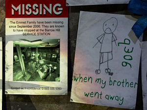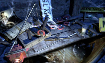 Je hebt je auto geparkeerd bij het voormalige tankstation annex restaurant annex motel, dat er nu vervallen en met een hek omringd uitziet.![]() Ga desgewenst eerst terug naar Opties in het Menu en vink opnieuw de ondertiteling aan. NB: Dit is een bug (foutje) in het spel. Telkens als je het spel laadt moet je de vinkjes opnieuw plaatsen. Ga de auto in en luister naar de zender BHR. Emma vertelt nog tussen de reclames door dat de 'gebeurtenis' van tien jaar geleden bekend staat als Q306 en dat toen duistere machten zijn ontwaakt, moeilijk te geloven voor hen die niet geloven, voor hen die Barrow Hill niet kennen. Kies de klassieke zender op de radio door op het 'pijltje' rechts van het schermpje te klikken. Weldra hoor je de angstige stem van Gus terwijl op het schermpje de woorden The Dark Path(het duistere pad) verschijnen: Dit is Gus Bevan, we hebben hulp nodig, zij komt op ons af; Je kunt nog andere zenders kiezen, waarbij de reclamezender enkele subtiele hints laat horen. Ga naar de gedenkplaats bij het hek. De telefoon gaat. Klik op je mobiel en neem op. Het gezicht van Mia Kendell verschijnt (ze draagt een neusringetje). Ze moet even op adem komen. Dan spreekt ze je aan als 'de journalist' en zegt dat ze je nummer van Emma heeft gekregen. Er is iets mis met deze plaats: Barrow Hill. Dan hoor je gezang op de achtergrond en hangt Mia op. Telefooncel Wacht nog even met het verkennen van de gedenkplaats. Laat het station aan je linkerhand en volg de weg. Je kunt niet verder dan een bushalte aan de rechterkant waar de bus stopt naar St. Awful. Ertegenover staat een rode telefooncel. Binnenin zijn allerlei foldertjes te vinden, maar je kunt er geen één van inzien. Vlakbij aan het begin van het bospad is een informatiebord van het Bosbeheer. De tekst luidt: De oude bossen zijn een zeldzaam voorbeeld van ongerept bosland uit Cornwall, buiten de gewone toeristenpaden en -gidsen. De bossen zijn een mooi mengsel van loofbomen, zeldzame soorten varens en 174 mosvariëteiten. De bossen zijn ook een mysterie voor archeologen, omdat de legenden zeggen dat niemand in staat is geweest om alle in het groen verborgen ongewone plekken te vinden en te onderzoeken, met inbegrip van: De Druïdenpoel - een kleine natuurlijke bron, waarvan wordt aangenomen dat deze een offervijver was, die duizenden jaren lang is gebruikt door heksen, heidenen en stammen uit de Bronstijd. Barrow Quoit - de stenen overblijfselen van een enorme neolithische grafheuvel, een 4000 jaar oude begraafplaats. Barrow Farm (ruïnes) - De laatste overblijfselen van een oude hoeve uit de 17e eeuw, een plek die hevige belangstelling kent van zonderlingen, heidenen, aanhangers van de gothic subcultuur en spokenjagers. Haal een plattegrond van Barrow Woods uit de bus die naast de tekst hangt. Die wordt in de inventaris opgeborgen. ![]() Je vindt er de locaties van een Picknickplaats, de Druïdenpoel, van Wensstenen, een Oude Eik (die de storm van 2004 niet heeft overleefd), de Oude Hoeve (bij de tractor), de Telefooncel, de Telefoonmast, de Barrow Quoit (een soort hunebed) en het Benzinestation (ongeveer waar de paarse tekst staat). Als je links van het informatiebord het bos in wilt, dan verschijnt een gekruiste hamer en moersleutel in beeld (actiecursor), ten teken dat je eerst iets nodig hebt voordat je tot actie kunt overgaan. Station Keer nu terug naar de gedenkplaats bij het station. Zoom in op de kaarten en posters. ![]() Je leert er onder andere dat het gezin Emmet verdween in september 2006, en dat Ben Kendell die in het station aan het werk was sindsdien wordt vermist. Op een kindertekening staat ook q306 vermeld. Neem een doosje lucifers mee dat bij de waxinelichtjes ligt en in de inventaris terecht komt. Je ziet de actiecursor bij een rode kaars. Steek die aan met een lucifer uit de inventaris. Daarna kun je de brandende kaars meenemen. Je leert nu ook dat de hond Wincey heet en ook wordt vermist. Zoom in rechts van de gedenkplaats en nogmaals op het ronde raam. Binnen branden kaarsen! Ga langs de kapotte schommel en een klimrek naar een gat in de houten schutting. Dankzij de kaars kom je vanzelf aan de andere kant uit. ![]() In de hoek achter de schutting staat een elektriciteitskast te zoemen. De actiecursor geeft aan dat je er iets zou moeten kunnen, maar voorlopig nog niet. Ga verder om het gebouw heen. De telefoon gaat opnieuw. Neem op. Mia weer. Haar broer Ben verdween een aantal jaren geleden (inmiddels tien jaar). De mensen zeggen dat hij dood is, maar Mia wil weten wat er precies met hem is gebeurd. Draai naar links en zie een symbool in de vorm van een Romeins cijfer tien dat op een stalen deur is geschilderd (actiepunt). Iets verder stuit je op een aantal oude autobanden. Rechts daarvan is een donker gat het bos in, maar de toegang wordt je nog ontzegd. Draai daarom naar links en klim (vanzelf) over de schutting via de autobanden. Binnenplaats Je bent nu op een binnenplaats die door gammele schuttingdelen is omgeven. Zoom onder het afdak in op de deur. Deze is nog niet te openen. Loop het donkere gat in onder het afdak en open de deur op het eind. Je bent nu in het kantoor. Zoom in de overwoekerde ruimte in op het bureau en pak een sleutel op die waarschijnlijk van de eerder ontdekte elektriciteitskast is. Ga terug naar de binnenplaats en draai naar links. Je ziet en hoop oude rommel waar de natuur oprukt. Zoom in op de driewieler en daarna op de doos links ervan. Je kunt de bekers en de koffiepot één voor één verwijderen en vindt dan een katapult. Zoom uit en draai verder naar links. De schutting bestaat daar uit een stel oude deuren. Nog verder draaien en je ziet een doorgang in de schutting. De telefoon gaat. Neem op en je ziet Mia weer. Ze rent kennelijk door het bos. Ze heeft het over Gus, Olly en zichzelf en vraag jouw hulp om haar hier uit te krijgen. Ze heeft een pentagram gemaakt en offers gebracht. Het duistere pad. Dat had moeten werken. Nu wordt ze achtervolgd. Je hoort een akelige stem murmelen o