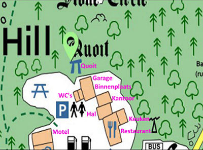 Verlaat de garage en ga bij de fietsen rechtsaf het bos in.
