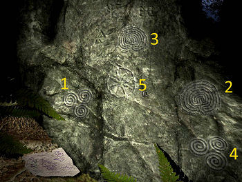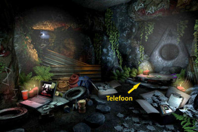 Ga voor de derde keer het bos in en op de viersprong (waar je de beide gevarenborden ziet) rechtsaf. Dat is het pad naar de mast.Klik bovenaan de trap naar rechts. Je ziet daar de oranje kabel lopen. Zoom in aan het eind ervan en je ontdekt de zender van Gus achter gebladerte. Nogmaals klikken om hem te kunnen instellen. Het briefje dat Gus in de telefooncel achterliet helpt daarbij (video, sterk signaal, ab, digitale monitor, noordelijk halfrond). Zet de knoppen bovenaan op On en VT (videotransmissie). Zet de middelste knoppen respectievelijk op 5 en Ab. En zorg dat de onderste knoppen achtereenvolgens op Rec. (opname), Monitor, Digi en N.Hem (noordelijk halfrond) staan. Dan verschijnt op het schermpje Signal Live, ten teken dat je signaal hebt. ![]() ![]() Zoom uit en pak Mia's telefoon. Klik op de knop videocamera. Dankzij de zender kun je nu zien wat er in de hoeve gebeurt. Mia zit in het pentagram en raakt in trance. Speel met de pijltjes- en huisjesknop om verschillende momenten waar te nemen. Laat de zender achter en volg de oranje kabel naar de symbolensteen. Klik de symbolen in de juiste volgorde aan (zie boven) en de takken die de rest van het pad versperden wijken uiteen. Barrow Hill Farm Vervolg het pad en je komt uit bij Barrow Hill Farm. Loop naar de ingang. Je hoort de door Baibin bezeten Mia murmelen. Breek de steenhoop bij de deur af door de stenen een voor een rechts neer te leggen. Je vindt een achtste SIM-kaart! Je kunt kloppen op de deur maar er wordt niet open gedaan. Klim door het raam. Daar staat Mia/Baibin! Ze zegt: Ik zie je. Maar in plaats van de Olly-behandeling wordt je geteleporteerd naar de wensstenen. Wensstenen Nu we daar toch zijn kun je kijken wat je er kunt bereiken. Bij de rechter stapeling met de brief voor Gus kun je de losse steen verschuiven en Gus' MP3-speler achterlaten. Maar rechts ervan moet ook iets komen te liggen wat je nog niet hebt. Bij de middelste steenhoop met het door Olly geschreven briefje kun je zijn ID-kaart kwijt (even de lossen steen verplaatsen) en zijn kapotte bril. Leg daarna zijn beeltenis ('vissymbool') bovenop en er volgt gezang met lichteffecten. Zou je Olly bevrijd hebben uit zijn benarde positie? De linker wensstenen behoren wellicht aan Emma, vanwege het briefje dat over haar gaat. We hebben niets van haar dus kom je voorlopig niet verder. Draai je om en ga richting de driesprong. Als je het bord wegversmalling voorbij bent gaat de telefoon. Het is Olly met nog de bibbers in de benen die je bedankt voor zijn bevrijding en zegt dat hij zich gaat verstoppen totdat de politie komt. Druïdenpoel Ga naar rotspartij bij de Druïdenpoel. Vergelijk het ingebrande gebedswiel met het 'slot' bovenop. De donkere markeringen op het slot moeten kennelijk naar beneden worden gericht zoals ook de pijl onder het slot suggereert. Maar eerst heb je een soort sleutel nodig. Pak opnieuw de hanger en plaats deze iets links van het midden van de rotspartij. Beweeg je cursor dan langzaam naar beneden onder de punt van de hanger. Je hoort een fluitend geluid. De cursor verandert in een pijl die naar linksboven wijst. Klik dan en je hebt een bronsleutel gevonden. Steek de bronsleutel in het slot bovenop de rotspartij en hij licht op met een paarse kleur. Je kunt nu drie witte ringen aanklikken, van buiten naar binnen 1, 2 en 3. Klikken op ring 1 laat ring 1 zelf rechtsom draaien en ring 2 linksom. Klikken op ring 2 laat alleen ring 2 zelf rechtsom draaien. Klikken op ring 3 laat ring 1 linksom draaien en ring 3 zelf rechtsom. Elke ring heeft een zwarte markering die aan het begin omhoog staat. De markeringen moeten echter naar beneden wijzen. Druk zo vaak op ring 3 totdat zijn markering naar beneden wijst. Druk dan zo vaak op ring 1 totdat zijn markering ook naar beneden wijst. En druk tenslotte zo vaak op ring 2 totdat zijn markering in lijn ligt met de beide andere. Er klinkt een melodietje en er stroomt helder water onder de rotspartij vandaan door een goot naar de poel. De poel is nu helder. Er is een actiepunt maar geen van de voorwerpen in je inventaris werken. Keer terug naar de mast en sla daar rechtsaf naar het station. Klim over de schutting en kijk naar de plek waar Olly in trance zat. Er staat een tas met een hanger erin, die Olly voor Mia had gekocht. Filmproject Ga de Quoit binnen en richt je op de laptop. Links bovenaan knippert een groen lampje bij de camcordericoon. Druk daarop en je achtste SIM-kaart wordt afgespeeld. Je ziet Mia die hevig in trance verkeert nu ze door Baibin is bezeten (klik erop om de clip te stoppen). Druk op de icoon rechtsonder (de boeken), kies 'Edit Project' en daarna 'Capture Clips' om deze laatste SIM-kaart in te lezen. Dan heb je alle acht clips onder in beeld, maar nog niet in de juiste volgorde. Je kunt als je wilt elke clip verslepen naar het midden van het scherm bij Film Preview en afzonderlijk bekijken. Het is de bedoeling de clips in een bepaalde volgorde onder in beeld te plaatsen door ze te verslepen. Hieronder volgt de juiste volgorde met enige verantwoording: Gus bekijkt een folder en verbrandt die (Het boek ligt achteraan op tafel). Fiets; Gus bekijkt het boek en dan de stapel folders. Gus haalt uit zijn tas met folders een verfspuit en spuit de X op een muur (Gus gaat dus meedoen met het verspreiden van de folders). Gus stopt de laatste folder bij iemand in de bus (Hij is een 'gelovige' geworden en zet zich in voor 'de zaak'). Gus klopt aan bij Barrow Farm maar doet dan zelf de deur open (Gus had Mia laten weten iets later te komen omdat hij eerst nog folders moest rondbrengen). Mia is bezig het pentagram op de vloer te tekenen (voorbereiding voor de oproeping). Mia laat aan Gus de symbolen in het boek zien. Die symbolen gaan dan over op haar armen (In de vorige clip was dat nog niet het geval). Mia maakt in trance wilde bewegingen (Ze heeft de symbolen op haar armen en is nu Baibin aan het worden). Als de clips op hun juiste plaats staan druk je op de knop 'Make Movie' (maak de film). D