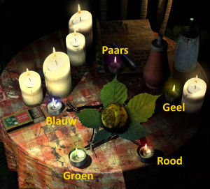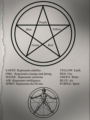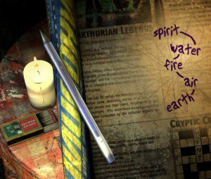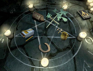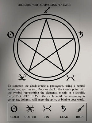 Links van de laptop ligt het door een zaklamp beschenen boek door James Tregowen: Het Duistere Pad.Open het en zie bovenaan drie 'boekenleggers' uitsteken. Bij de linker krijg je informatie over pentagrammen. Oproepingspentagram Om de doden op te roepen: maak een pentagram, met behulp van een natuurlijke stof, zoals zout, meel of krijt. Markeer elke punt met het symbool dat de elementen, metalen of een bepaalde godheid voorstelt. VERLAAT DE CIRKEL NIET totdat de ceremonie is beëindigd, zo niet dan zal de geest vertoornd raken of binden aan jouw wereld. GOUD KOPER TIN LOOD IJZER Breng de offers: gaven (vaak in de vorm van metalen, mineralen of edelstenen) worden in een bepaalde volgorde rondom het Pentagram geplaatst, dit om de geest naar de cirkel te verleiden. ![]() ![]() Bindingspentagram