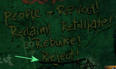 Je ziet hem nu in close-up. Er staan ietwat eigenaardige graffiti op. Lees (rechtsklik) op alle woorden: reclaim, revolt, rebuke, reject en retaliate.