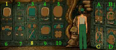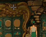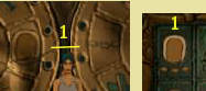 Kijk naar de fraai bewerkte deur op de achtergrond. Je ziet dat de uitgesneden figuur twee hendels in zijn hand heeft. Trek om beurten aan beide hendels. Er gebeurt niets.