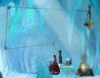 Ga terug naar de ijsvlakte en geef Ulus de appels (of praat tegen hem, met hetzelfde resultaat). Ulus loopt tevreden weg en Critter kan dan de vislijn met aas (baited line) pakken.